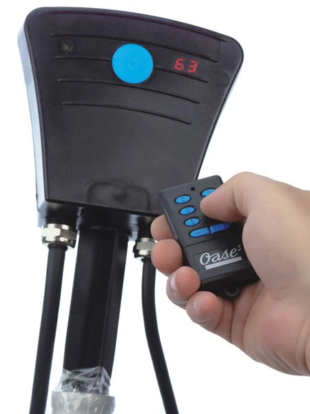 Die besonders leistungsstarken Filterspeisepumpen OASE Aquamax Twin fördern verschmutztes Wasser mit bis zu 11 mm Korngröße. Die überwinterungstaugliche Pumpe hat zwei voneinander getrennt schaltbare Motoreinheiten, die per Funk an- und ausgeschaltet sowie elektronisch gedimmt werden können. Dank der Digitalanzeige am Empfänger ist eine präzise Einstellung der Leistungsstufe möglich.
