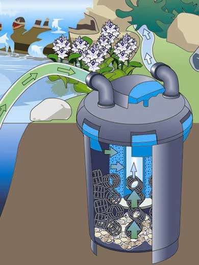 | Reinigungsgriff Einfachste Wartung durch im Deckel integriere Reinigunsfunktion | Schnellverschluss Für das einfache Öffnen und Schließen des Filters. | Unterschiedliche Filtermaterialien Das Filtergestein im Netzbeutel bietet ausreichend Besiedelungsoberfläche für Filterorganismen. Bioballs, mit der speziell entwickelten Strömungsführung, bieten neben den Filterschwämmen nochmal zusätzliche Filteroberfläche und befinden sich frei beweglich im Wasserstrom. | Integrierte UVC-Einheit Das integrierte UVC sorgt für die rasche Beseitigung von Algen und Krankheitserregern im Teichwasser. |