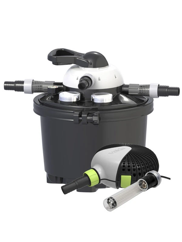 Neben der normalen Filterung gibt es verschiedene Fließrichtungen um Fischmedikamente zuzufügen, den Filter zu reinigen oder den Teich zu entleeren. Bei der Backwash Funktion fließt das Wasser in entgegengesetzter Richtung durch den Filter und nimmt den angesammelten Schmutz mit. Sie haben die Möglichkeit die Filterleistung zusätzlich zu erhöhen indem Sie eine weitere, optional erhältliche (siehe unten unter Zubehör), UVC-Einheit in den Filter integrieren.