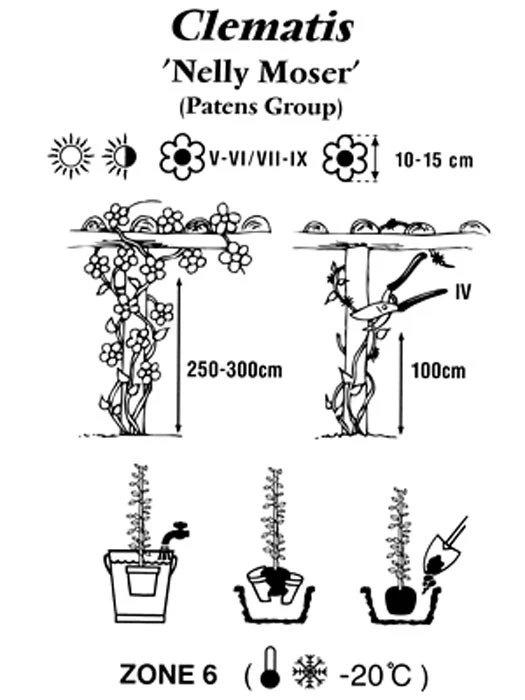 | Besonderheiten, Pflege: | Keine Staunässe. Bei der Pflanzung den Ballen eine Handbreit unter die Erdoberfläche setzen. Rückschnitt: siehe Pflanzung und Pflege von Clematis |