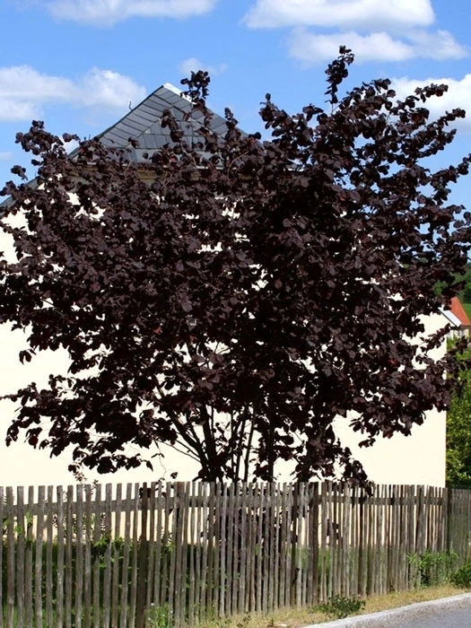 | Blatt: | Dunkel-braunrote, rundliche Blätter. Sommergrün, im Winter laublos. |