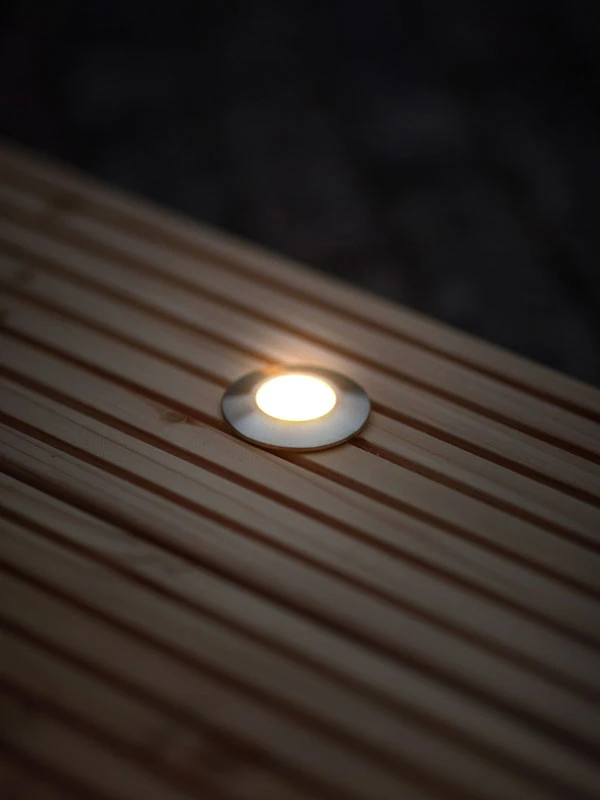 Das Starter-Set des Ludeco Einbaustrahlers Olan 80 eignet sich sehr gut zum Verarbeiten inTerrassendielen. Seine 48 Lumen sorgen für ein warmweißes Licht, das sich ideal als Stimmungslicht oder zur Beleuchtung eignet. Die drei Edelstahl-Spots sind sehr energieeffizient und mit ihrer Schutzart IP44 spritzwassergeschützt. Die Leuchte Olan verfügt über das Plug & Play-System.