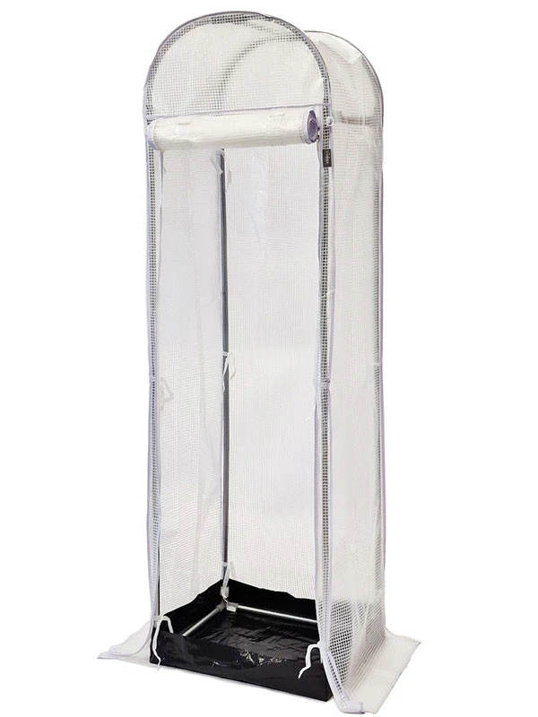 Balkonpflanzen platzsparend im Außenbereich überwintern, mit dem Videx Frost-Schutzhaus SNOW. Das mobile Balkon-Frostschutzhaus ist schnell auf dem Balkon, im Hof, oder der Terrasse aufgebaut. Das stabile, pulverbeschichtete Metallgestänge kann sehr leicht zusammengesteckt werden. Die lichtdurchlässige Gitterfolie schützt Balkonpflanzen vor Schnee, Nässe, Wind und leichtem Frost. Im Sommer ist das Zelt auch als Anzuchthaus für Gemüse und Stecklinge für Blumen zu verwenden. Ein zusätzlicher Metallboden schafft Ablagefläche für kleine Töpfe. Die separate Bodenplane ist rundum über Klettverschlüsse fixiert.