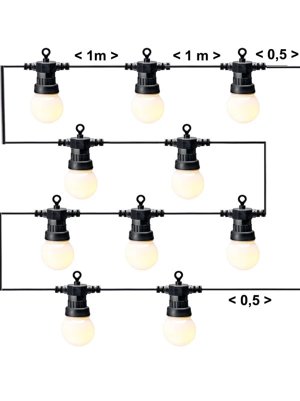 Zu einer richtigen Gartenparty gehört auch die richtige Beleuchtung. Mit dem Partylights von Garden-Lights setzen Sie jedes Gartenfest in Szene. Man kann bis zu 5 Partylights aneinander verbinden und somit bis zu 50 m erreichen. Die Lichterkette kann nur mit Garden Lights Transformatoren betrieben werden. Falls der weibliche Stecker nicht benutzt wird, immer die Kappe aufsetzen, um das Produkt dicht zu halten.