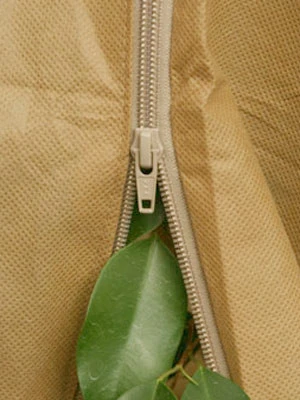 Große Pflanzen mit ausladenden Kronen oder Rosen mit dornigen ästen lassen sich bequem in den Thermomantel hüllen. Legen Sie den Thermosmantel seitlich um die Pflanze und ziehen die Kordeln oben locker an. Dann den Reißverschluss schließen. Zum Schluß beide Kordeln straff zuziehen, dann schließt der Thermomantel Ihre Pflanzen vollständig ein.